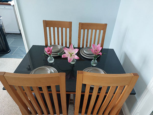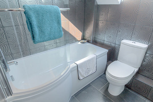 The fully-equipped Kitchen is accessed via a single Glazed Door off the Dining Area and features Wooden Worktops and a Tiled Surround. It includes a Double Electric Oven and Ceramic Electric Hob, Fridge with Freezer Compartment, Dishwasher, Washing Machine, Microwave, Toaster and Kettle. All crockery and cutlery, cooking utensils, hand towel, tea towel, dishcloth, scourer are provided along with dishwasher tablets, washing up liquid, liquid soap and other kitchen cleaning products. A Slow Cooker is also provided for guests to use, handy if you wish to put the dinner on in the morning so it’s ready for you later in the day.