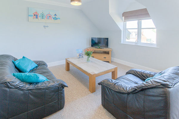 To the left of the Hallway, there is an open plan, carpeted Lounge and Dining Area, accessed via Glazed Double Doors. This living space boasts fantastic sea views and stunning evening sunsets. The main lighting is via a dimmer switch for your individual comfort and there is also one floor lamp. Within this area you will find an LCD 32 inch Freeview TV with built in DVD Player, two Double Leather Sofas, a Granite Topped Oak Coffee Table with up-to-date local information/leaflets and information about the apartment, and a Nest of Tables.